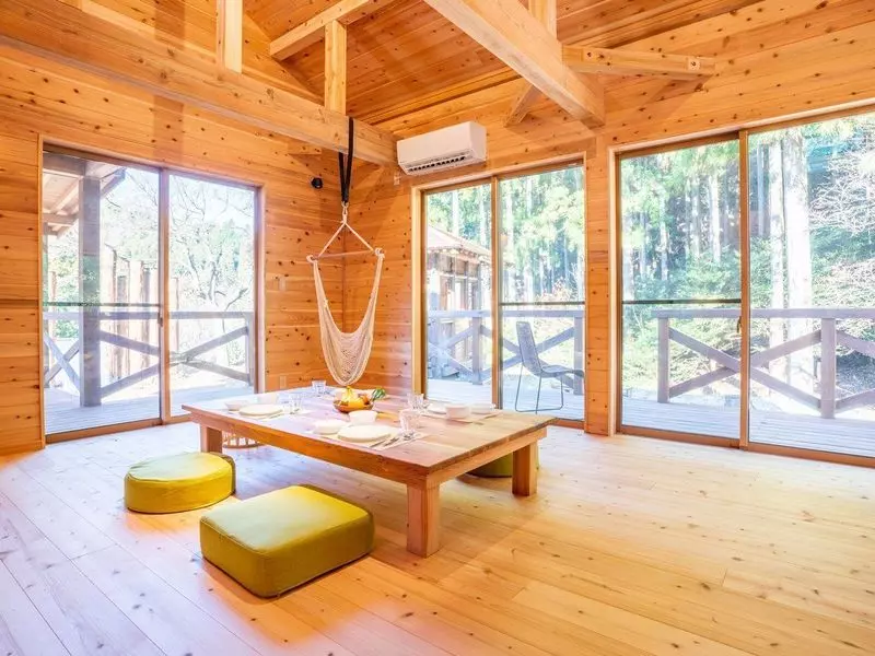 客室は木の温もりが感じられるコテージ!開放的な空間が広がっており、大人数でも優雅なひと時が過ごせます。焚火台や木曽檜(きそひのき)の外風呂(※)などもあるので、都会では味わえない非日常感を感じられるでしょう。