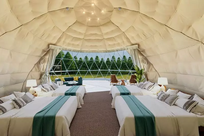 配置されているグランピングテントは、直径約7mにも及ぶドーム型!ラグジュアリーな空間が広がっており、優雅なひとときが過ごせます。さらにプールやBBQスペース(※)などが設けられているので、ちょっとしたリゾート気分を味わえるのも魅力です。