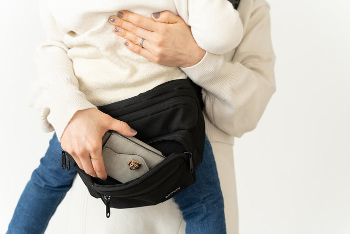 「POMULU 2WAYヒップシート」は、ショルダーバッグがそのままヒップシートに変身するので、これひとつで身軽にお出かけを楽しめるアイテムです。見た目以上に抱っこがらくになり、滑り止めや腰サポートクロスを使うことで、安全面もしっかりサポート。