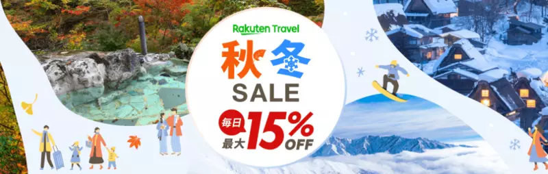 楽天トラベルで秋冬の旅行がお得になる「秋冬SALE」が11/10まで開催中!毎日最大15%OFFになるお得なセールなので、11月以降の旅行を計画中な方は、ぜひ利用してみてください!