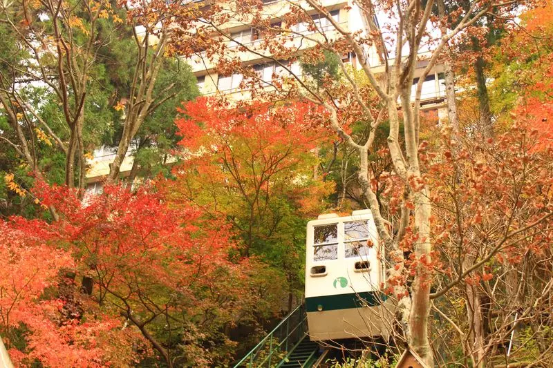チェックインの際はこのケーブルカーで紅葉をくぐりぬけて宿へと向かいます。
