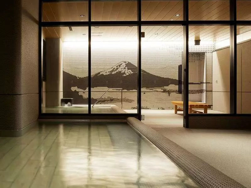 ホテルに設置されている大浴場は、落ち着いたモダン空間が特徴。開放的な浴槽が広がっており、肩までどっぷり湯船に浸かれます。