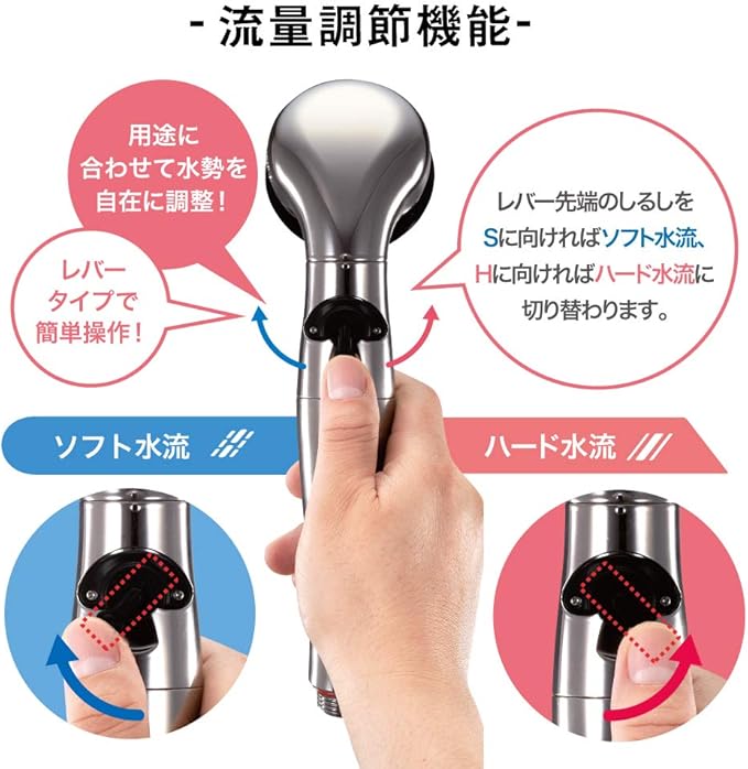 水の量を「ソフト水流」と「ハード水流」の2段階(※)で調整できるレバーも付いているので、節水しながら浴び心地の調整も叶うシャワーヘッドです。