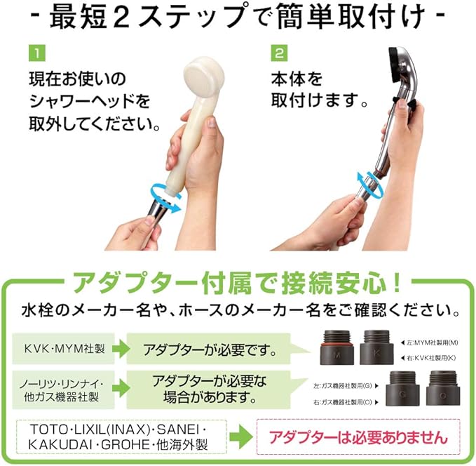 まずはシャワーヘッドの取り付け口を確認し、自宅のシャワーに希望する低水圧用シャワーヘッドが取り付け可能かどうかチェックしましょう。付属のアダプターが必要な場合もあるので、自宅のシャワーメーカーも調べてみてください。