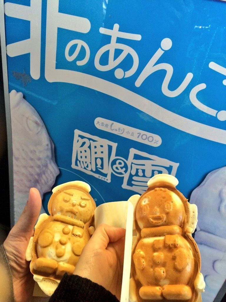 北海道ならではの雪だるま型のたい焼きは女の子、男の子の形があり、思わず写真を撮りたくなる程の可愛らしさ!