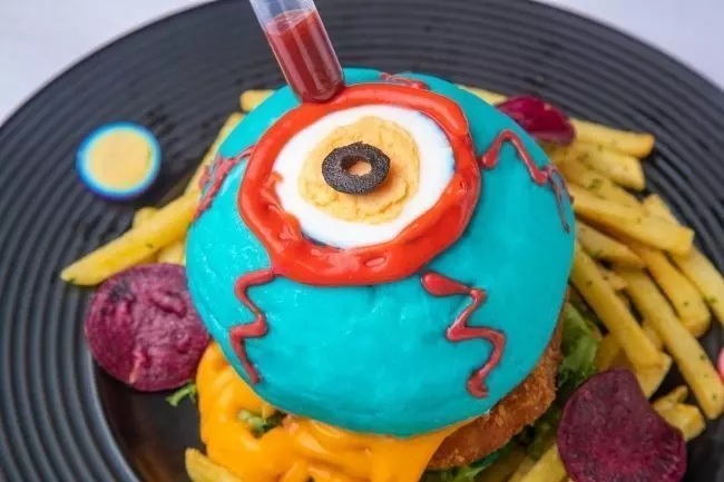 真っ赤な目玉のブルーバーガーに照り焼きチキン、チェダーチーズをたっぷり挟んだカラフルポップバーガー「目玉Monster」です。真っ赤なチリソースをバンズに注入しちゃいましょう!