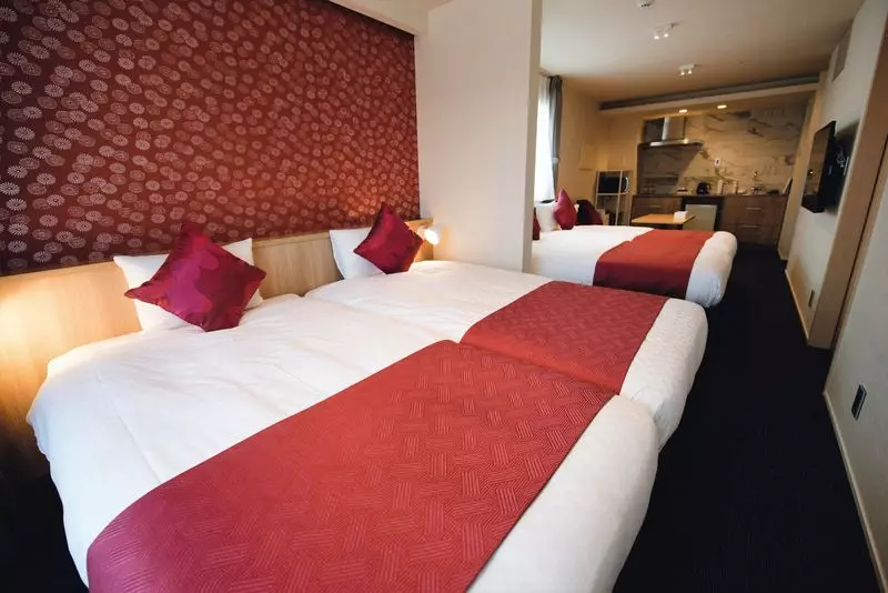 家族やグループでアパートメントホテルを利用してみたいという方におすすめなのは、平安神宮の大鳥居をモチーフにした和モダンな空間「朱(アカ)」。こちらの客室は、グループ利用がしやすいよう、ベッドの数も2つもしくは4つ(※)の客室から選べます。
