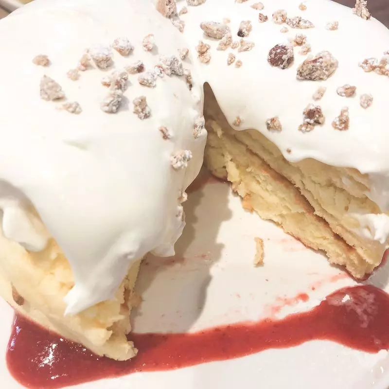 たっぷりと敷かれたいちごのソースの上には、ふわふわのパンケーキ、さらにその上に甘さ控えめの生クリームとナッツがトッピングされています◎