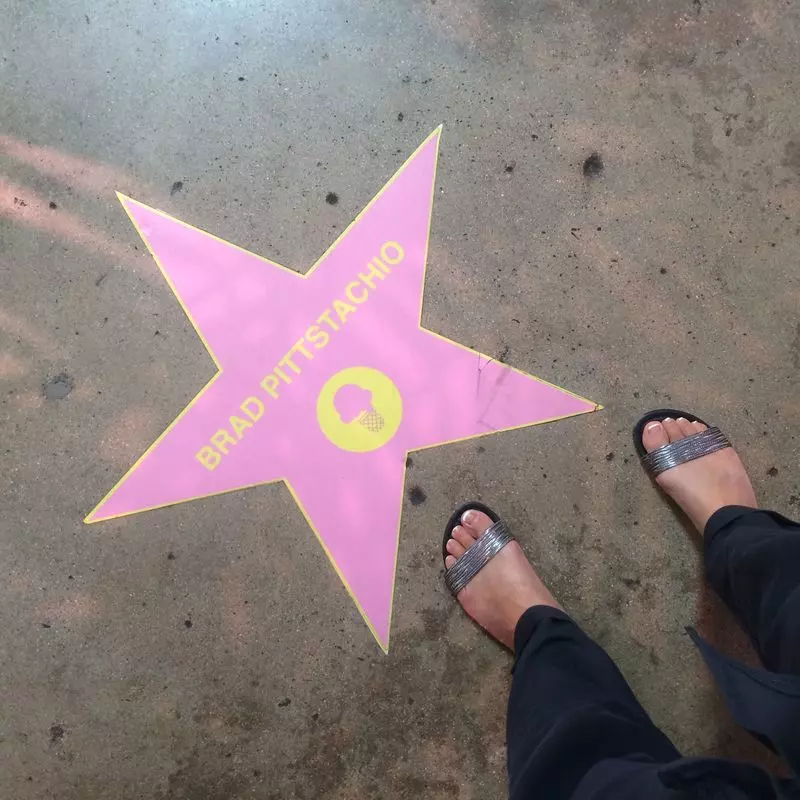 エンターテイメント界で活躍した人物の名前が彫られた星型のプレートが埋め込んである有名な「ハリウッド大通り」をイメージした星型です☆これもピンク~。