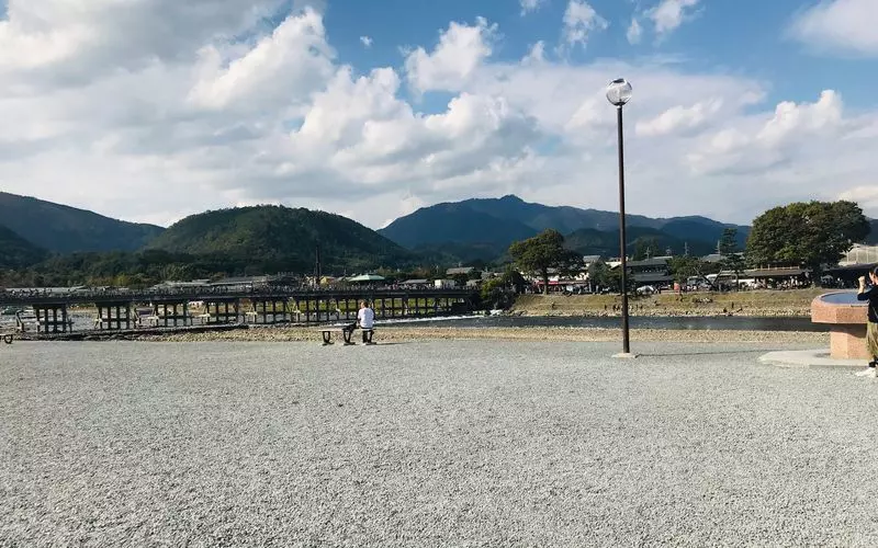 「渡月橋(とげつきょう)」を渡った先には、グルメ、雑貨などあらゆるジャンルのお店が立ち並んでいます!