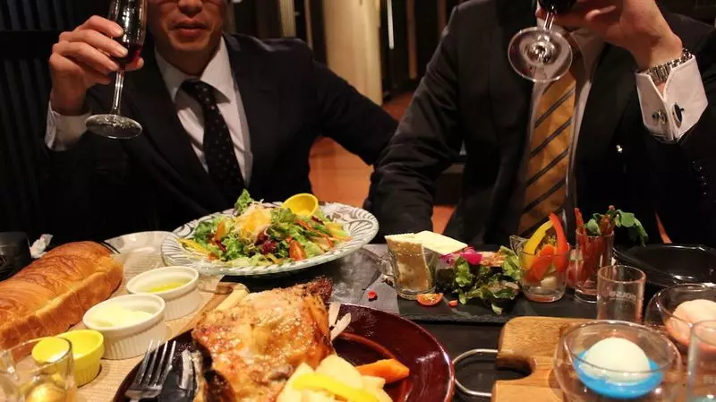 この贅沢な丸ごとチキンを切るのは、力強いメンズ?