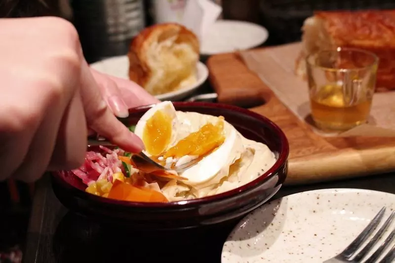 「ウフマヨポテトサラダ」¥380(税抜)は、丸ごと入ったジャガイモを自分で潰して食べるスタイルのポテトサラダ。