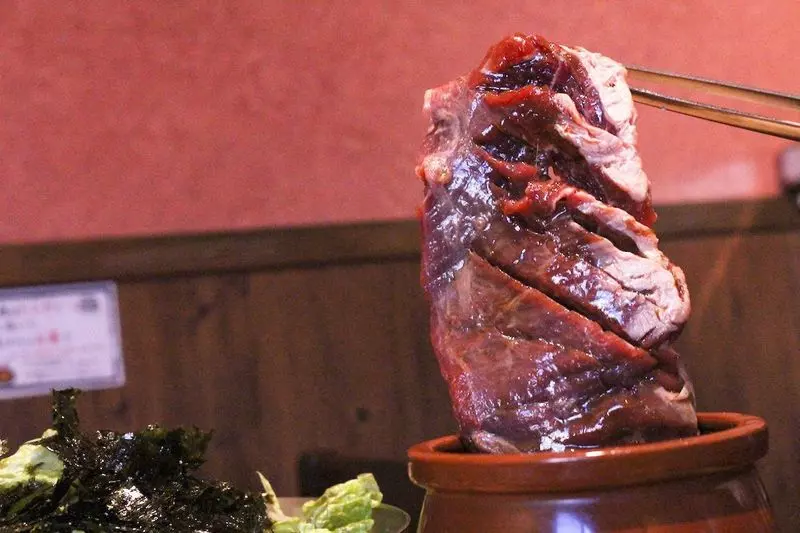 にんにくと生姜の入った醤油ベースの特製ダレに漬け込まれた大きなハラミ肉を壺から取り出すと、その重みにびっくり!