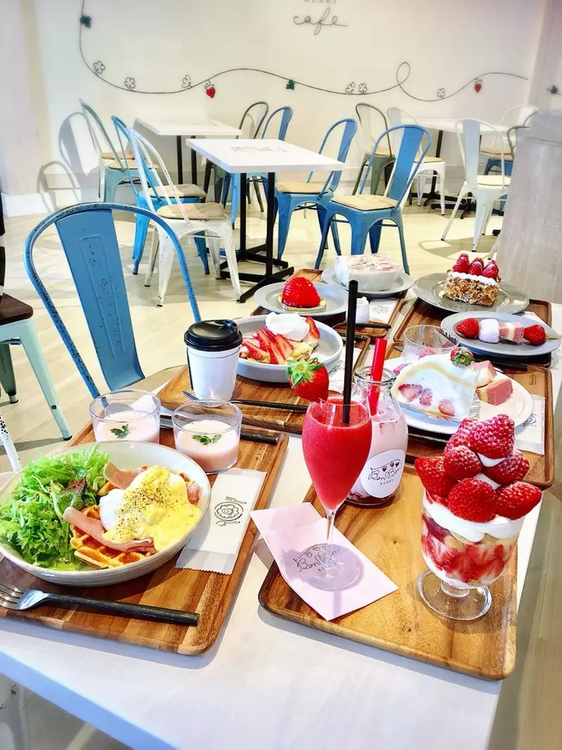 テーブルに並んだいちごスイーツにフード、圧巻ですよ!