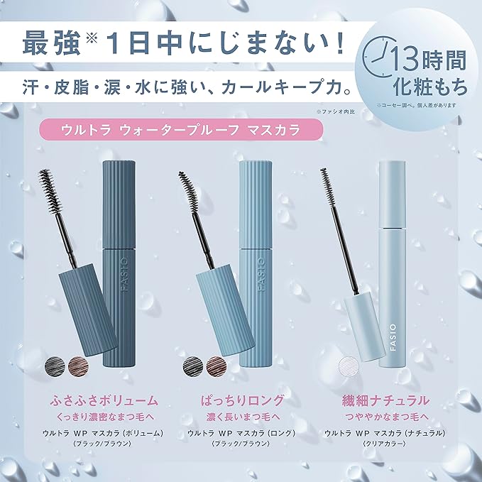 『FASIO(ファシオ)』の「ウルトラWPマスカラ」は、「ボリューム」「ロング」「ナチュラル」の3タイプを展開するマスカラ。汗や水に強いウォータープルーフで、ぽろぽろ落ちたりパンダメになったりしにくいのが特徴です。