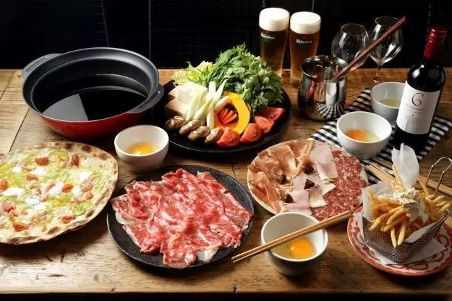 アフェッタートミスト(生ハム盛り合わせ)フレンチフライ/本日のローマピッツァ/関村牧場 赤姫和牛サーロインの赤ワインすき焼き風しゃぶしゃぶ/春菊、水菜、しいたけ、えのき、根菜のメランジェ(大根、紅芯大根、人参)/〆雑炊