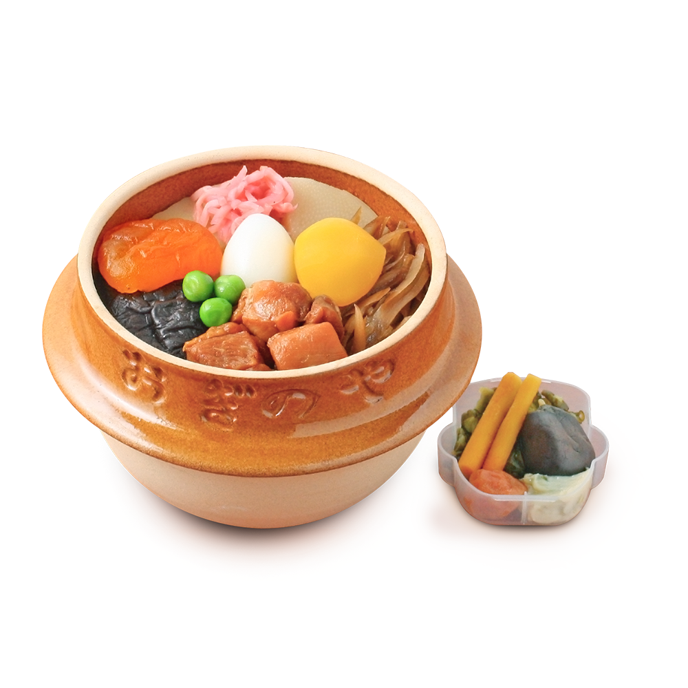 「峠の釜めし」は、自家精米コシヒカリの上に鶏肉やごぼう、椎茸など約9種類の具材を乗せた商品です。保温性の高い益子焼の土釜に入っているので、最後まで温かいまま食べられるのがポイント!