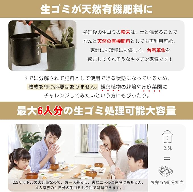処理後のゴミは、土と混ぜて数ヶ月おくことで肥料としても使用可能。価格も比較的リーズナブルで購入しやすく、一人暮らしやカップルにおすすめの生ゴミ処理機です。