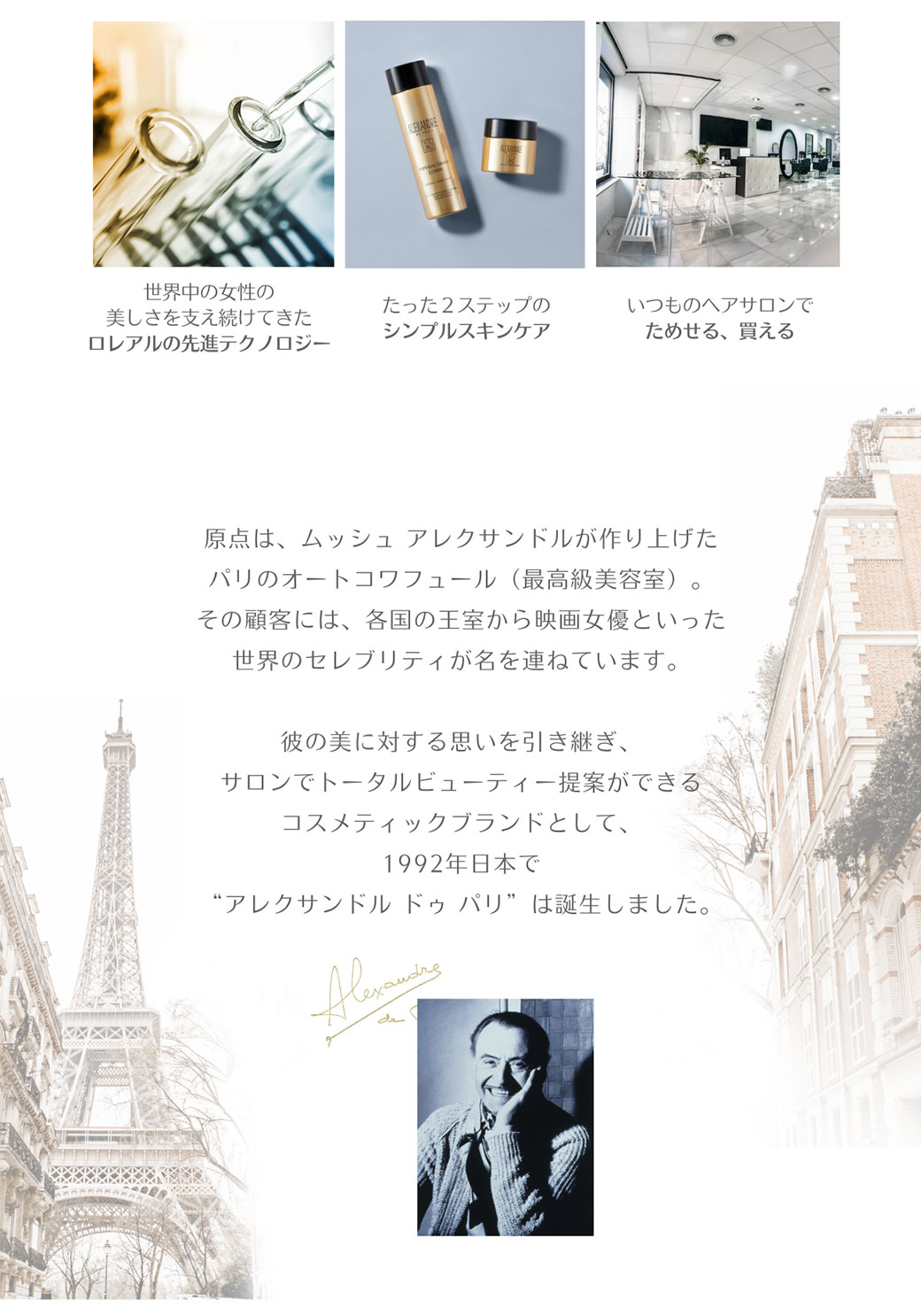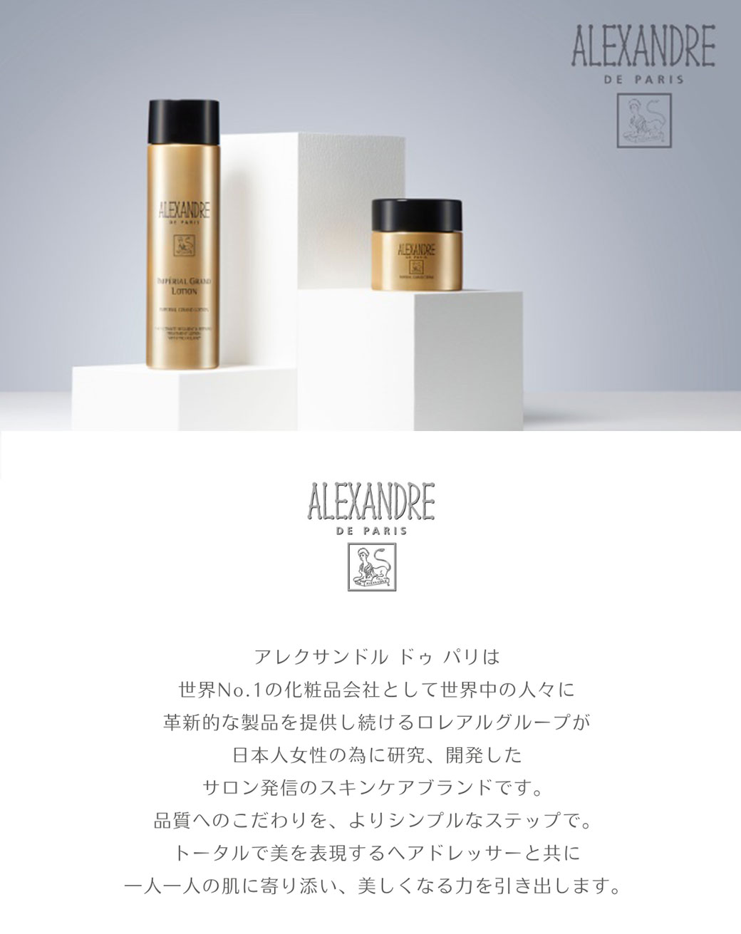 『アレクサンドル ドゥ パリ』は、世界で展開されている化粧品会社の『ロレアルグループ』が日本人の女性向けに研究と開発をしたサロン発信のスキンケアブランドです。美容室で気軽に試したり購入したりできるアイテムが揃っています。