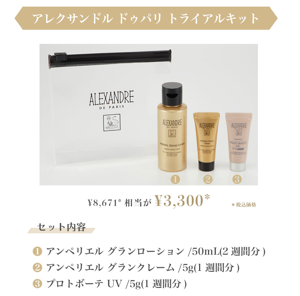 美容室でも扱われる『アレクサンドル ドゥ パリ』の人気エイジングケアシリーズ「アンペリエル グラン トライアルキット」を口コミと合わせて紹介!約1〜2週間分の化粧水とクリーム、日やけ止めを試せるお得なセットです。「簡単にしっかりとスキンケアをしておきたい」という方は、まずはお試し使用を検討してみましょう!