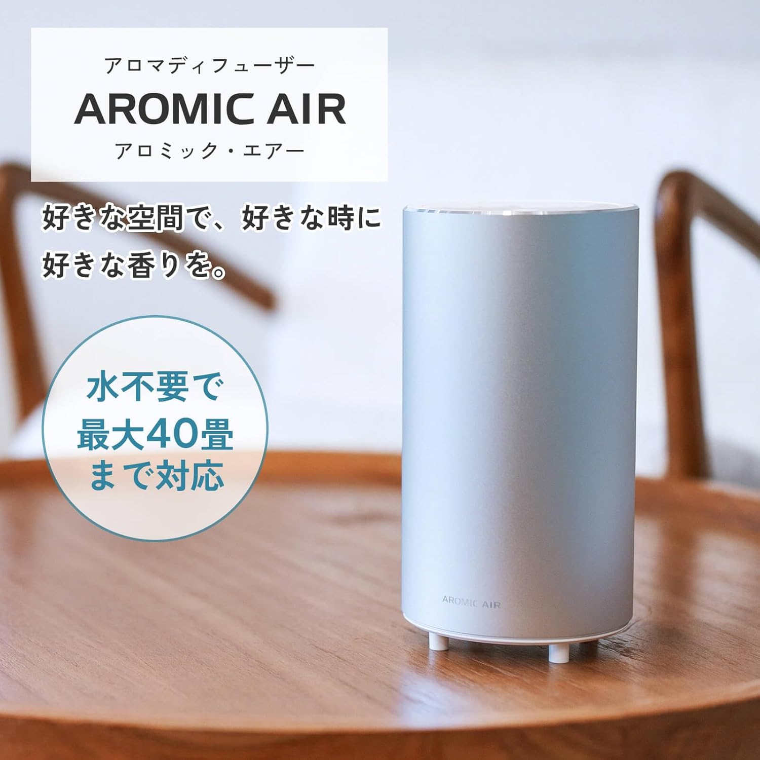 AROMIC Air(アロミックエアー)の「Aroma diffuser」は、水を使用せず天然精油を直接吸い上げ、送風ファンの力で部屋に自然な香りを拡散します。水を使用しない設計のため、メンテナンスが簡単なのもうれしいポイント。