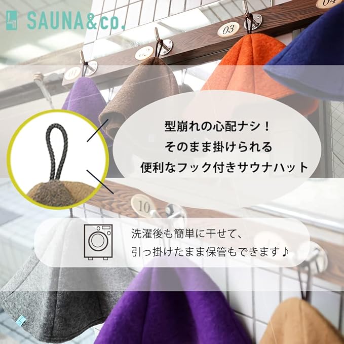 使用感も考慮されており、サウナでの使用後は、手軽に洗濯機で洗えます。実用性とデザイン性を兼ね備えたサウナハットです。
