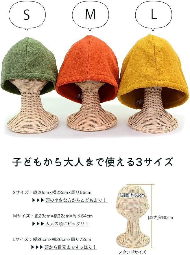 頭の小さな方や子どもにおすすめのSサイズ、大人の頭にぴったりのMサイズ、目元まですっぽり入るLサイズの3サイズ展開。家族でそれぞれ好きな色、ぴったりサイズのサウナハットをそろえるのもよさそうです。