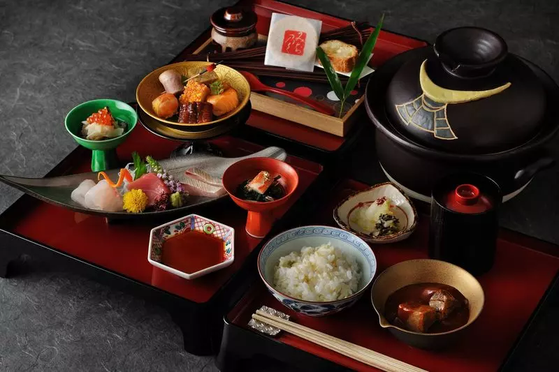 会席料理は、牛テールと仙台味噌のリエットに、宮城県名産の仙台麩や手焼きの「みち乃くせんべい」をつけて食べる先付けから始まります。先付けや、酢の物、八寸、お造りを一緒に盛り合わせた「宝楽盛り」は、まるで大名の食事のような脚つきのお膳で楽しめるのがポイント。戦国武将の伊達政宗が戦いの場で着用したといわれる、水玉模様の陣羽織の柄が施された器にも注目です。