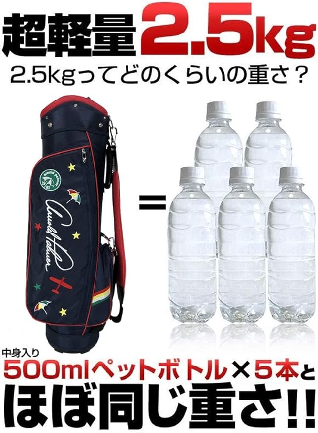 キャディバッグは約4〜5kgのものが多いですが、本記事で紹介している『Arnold Palmer(アーノルドパーマー)』の「キャディバッグ APCB-09J」は約2.5kgとかなり軽量です。