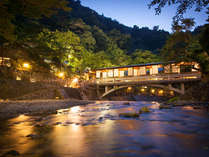 宿泊棟とロビー棟の間には、川が流れていて、自然に囲まれた旅館です。心地よい川のせせらぎを聞きながら大人の時間を過ごしてくださいね♪