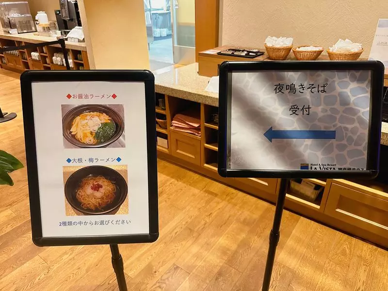 トレーラーハウスに戻る途中、夜に取材すべきスポットを思い出しました。そう、ラビスタ観音崎テラスでは、20時から22時45分の間*レストランで夜鳴きそばを提供しているのです。普段の生活では罪悪感を抱きがちな夜食も、旅先では非日常感あるお楽しみに変わってしまうから不思議ですよね。