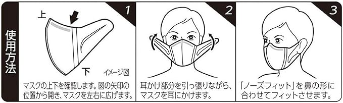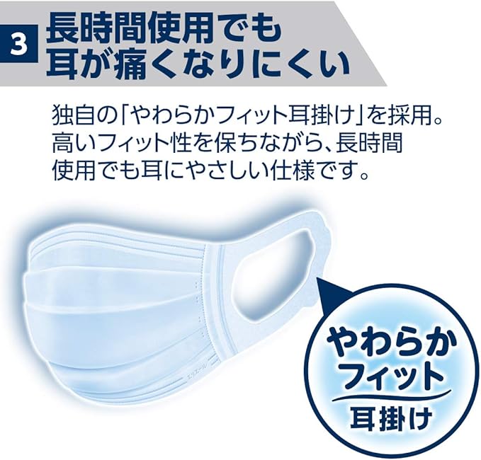 フィット性が高く、長時間つけていても耳が痛くなりにくいマスクです。
