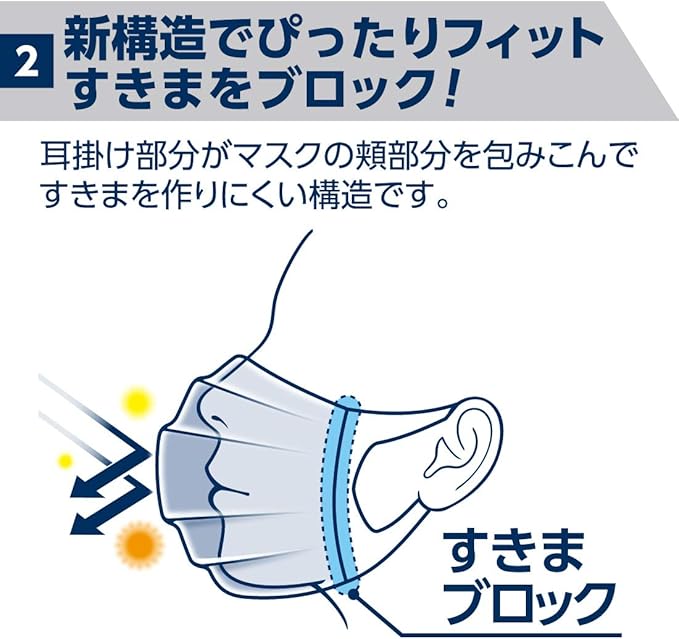 「ハイパーブロックマスク」は、耳掛け部分にこだわりのあるマスク。エリエール独自の「やわらかフィット耳掛け」を採用し(※)、マスクが頬を包み込んで横の隙間を作りにくくしています。