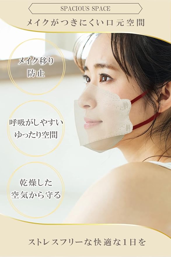 口元にしっかりとスペースがあり、マスクにリップやメイクがつきにくいのが特徴。息がしやすいのも魅力です。カラーは3色展開で、ユニセックスのマスクです。