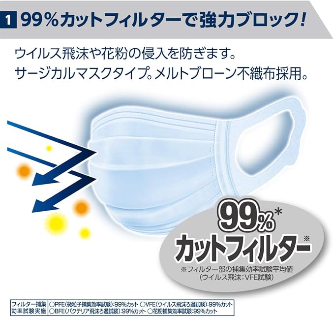 1枚1枚が個包装で、旅行での持ち運びや常備用におすすめ。カケンテスト(※)済みのマスクは、4層構造で捕集効率がよいとされています。顔との接地面が少ないため、息がしやすいのもポイント。