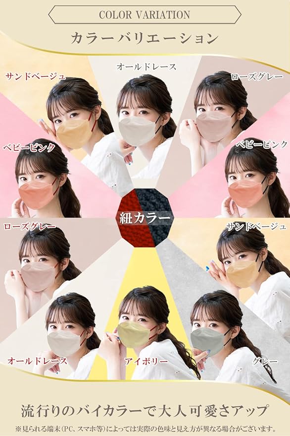 マスク本体と紐部分の色が異なるので、メイクや服装に合ったカラーを見つけてみてください。