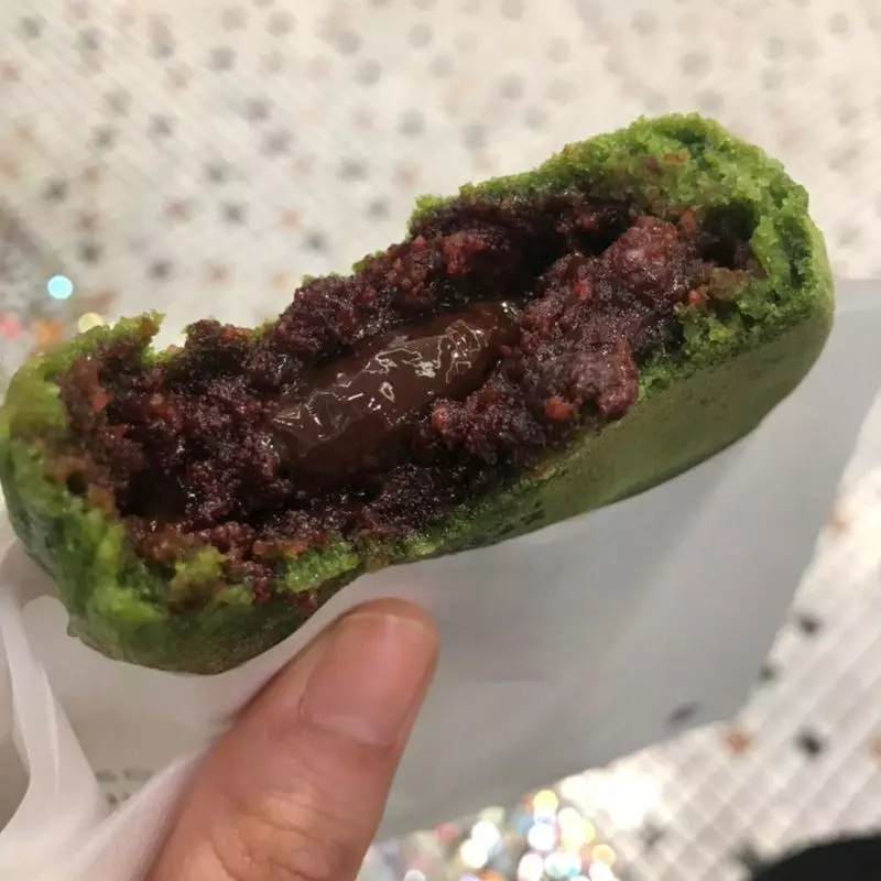 こちらはマカロンをモチーフにした、チョコレートがたっぷり入った洋風の今川焼のような仕上がりとなっています。その場で頂けばまだ温かく、ギュッと中心を押せば中のチョコレートがとろけ出てきました♡