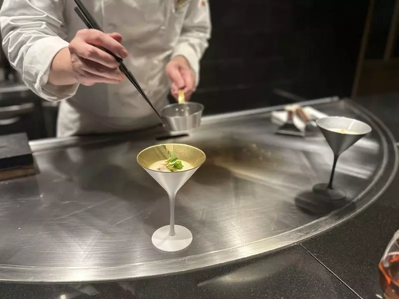 着席すると臨場感がすごくあり、シェフとの距離も近いので、調理工程やパフォーマンスはもちろん、食材や料理のことなど会話も含めて楽しむことができます。
