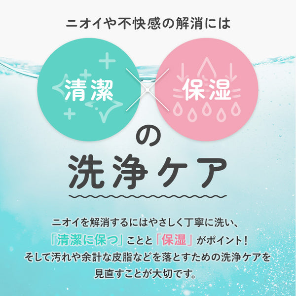 皮膚を保護してくれるグリーンクレイ(※1)と浄化作用のニアウリ(※2)を配合した、やわらかい泡で洗うことで、湿気によるムレやにおいなどの不快感を軽減します。さらっとべたつかないテクスチャーで、毎日使いたくなる使用感がおすすめポイントです。