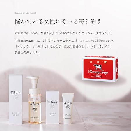 『&fem(アンドフェム)』は、赤箱でお馴染みの『牛乳石鹸』から初めて誕生したフェムテックブランド。「フェムケア泡ソープ」は、ワンプッシュでなで洗いするだけで、ニオイやムレ感を抑制。溜まった古い角質や皮脂汚れをしっかり洗浄し、気になるくすみも軽減してくれます。