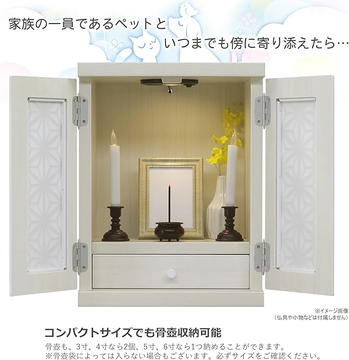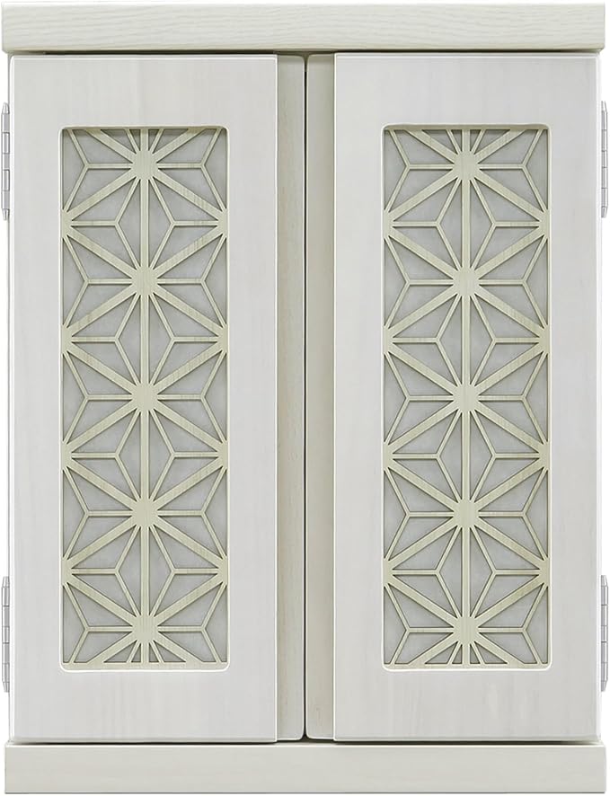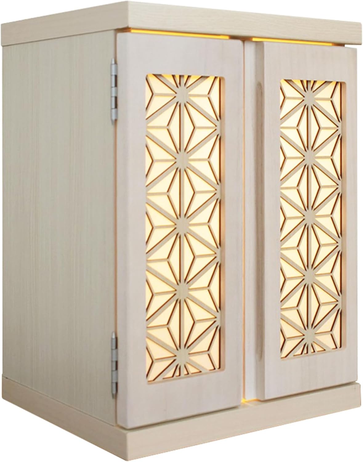コンパクト仏壇 桐材 和紙張りは、祈りの空間に華やかさを加えてくれる、上品な印象の麻の葉模様の扉が特徴的な仏壇です。LEDダウンライトが内部を明るく照らし、小窓には和紙が貼られています。