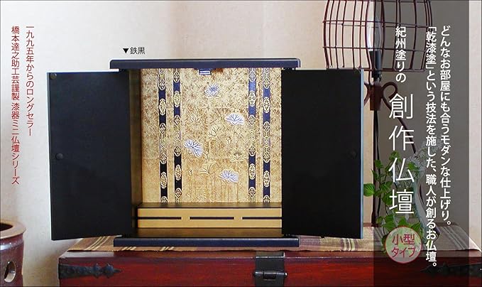 紀州塗り ミニ仏壇は、棚に置けるのがうれしいコンパクトサイズの仏壇。乾漆塗りという技法を用いており、汚れが目立ちにくく、艶消し仕上げのシンプルでモダンなデザインが特徴です。