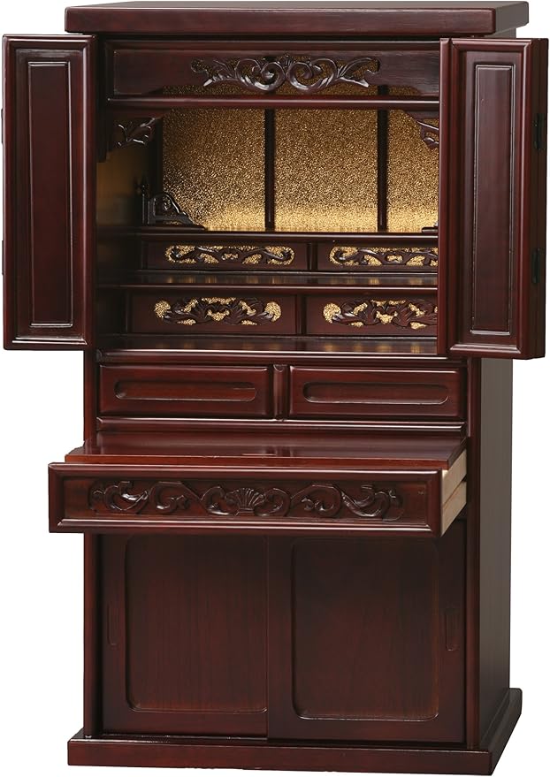 彫刻入り仏壇はエレガントで美しい本格的な彫刻が施され、リーズナブルな価格ながらも高級感が漂う仏壇です。床置きタイプの中でもコンパクトなサイズであり、大型の仏壇と比べても圧迫感をあまり感じさせません。