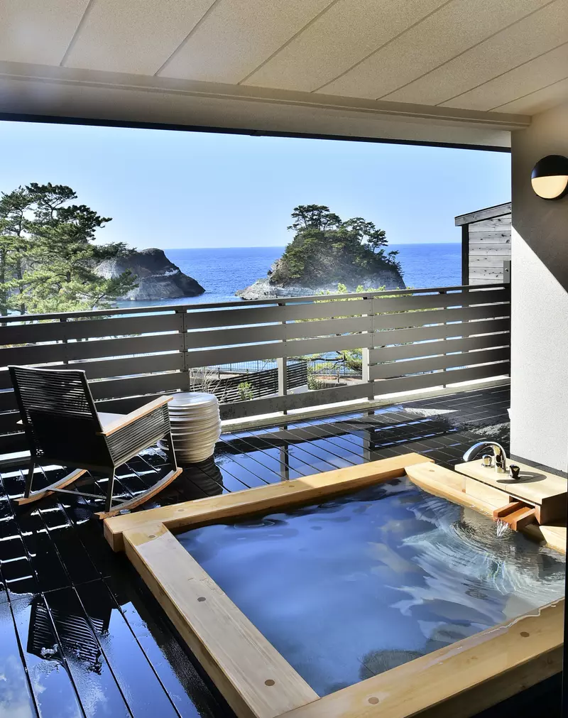 「世界ジオパーク伊豆 繭二梁」の魅力はまだまだ!こちらには、お部屋とは別に貸切で利用できる「プライベート・シエスタ」があり、露天ジェットバスを楽しむことができます。