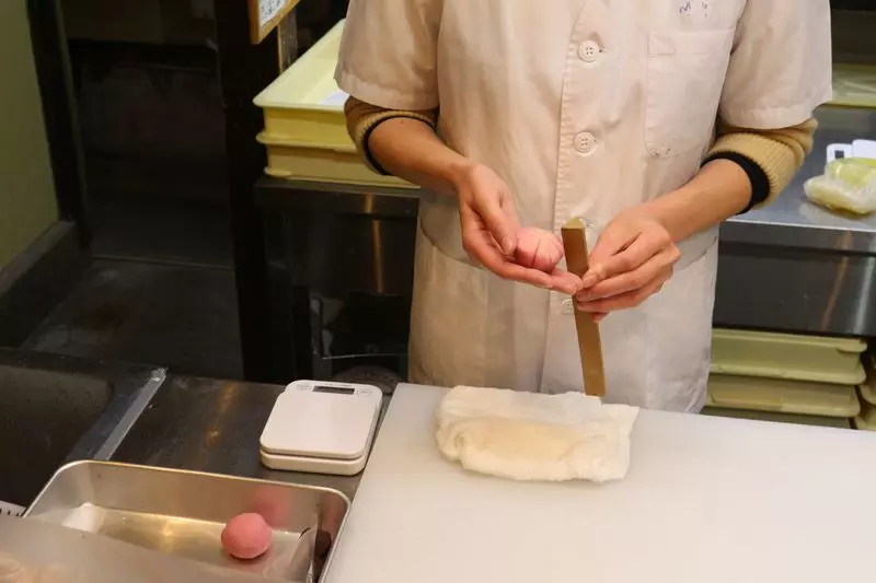 こちらは上生菓子を作っている様子です。上生菓子は目でも舌でも季節を愛でられるもの。職人ならではの芸術的感性が、活かされる作品といえます。