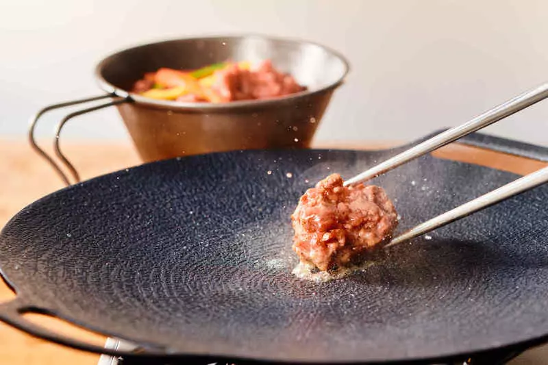 焼肉スタイルで提供されるこのハンバーグは、鉄板で一口サイズにカットし、自分で焼いて楽しむ新感覚の料理。6種類(※)のタレを使い分けて多彩な味わいを体験できます。