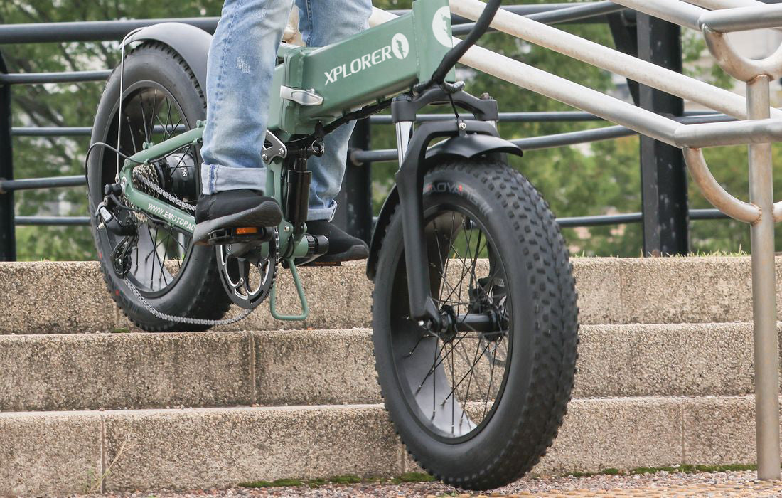 「XPLORER」は、4インチの極太タイヤが特徴で人の目を引くパワフルな存在感が魅力。前後にフルサスペンションを搭載しており、路面の段差や障害物の衝撃を吸収してくれるため、楽に快適に走行できます。