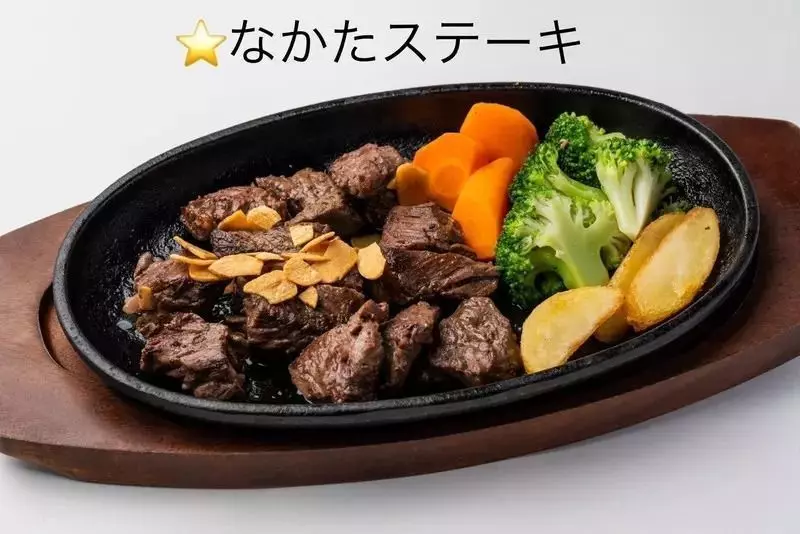 人気メニューは「なかたステーキ」990円(税込)。サガリとハラミを特製のタレに漬け込んで焼き上げた逸品で、ジューシーな肉の旨みを堪能できます。お酒ともご飯とも相性ばっちりです。