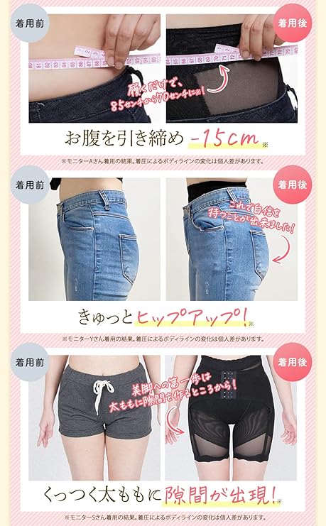 - 小さすぎるサイズを無理矢理選ぶと、引き締めが強する可能性があるため、自分のウエストやヒップの寸法に合わせて、ゆとりのあるサイズを選びましょう。