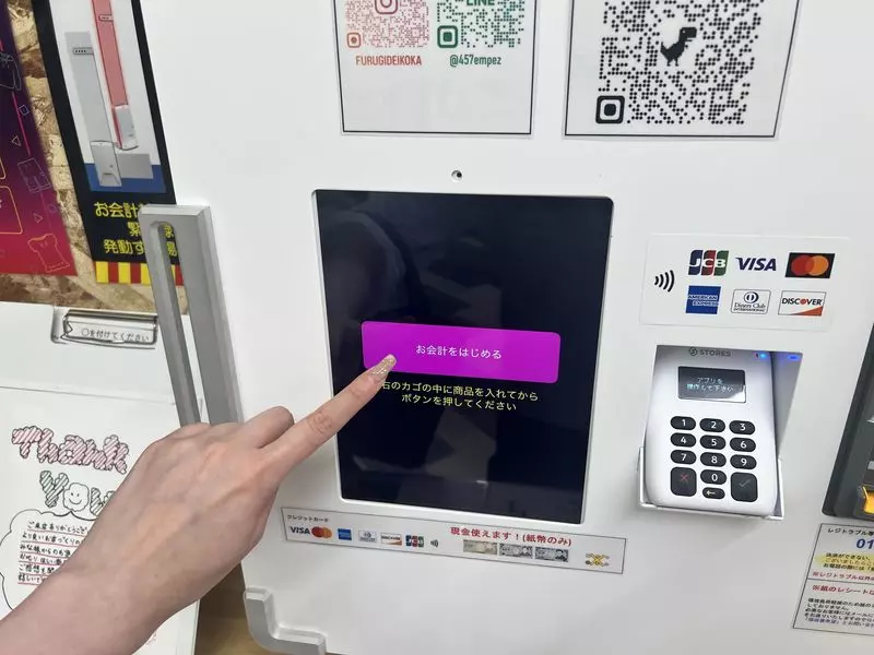 「古着de行こか。」はかごに入れるだけで精算ができる、簡単なセルフレジを採用しています。支払い方法はクレジットカードとPayPay、現金で幅広い方のニーズに対応しているハイブリッドな古着屋です。